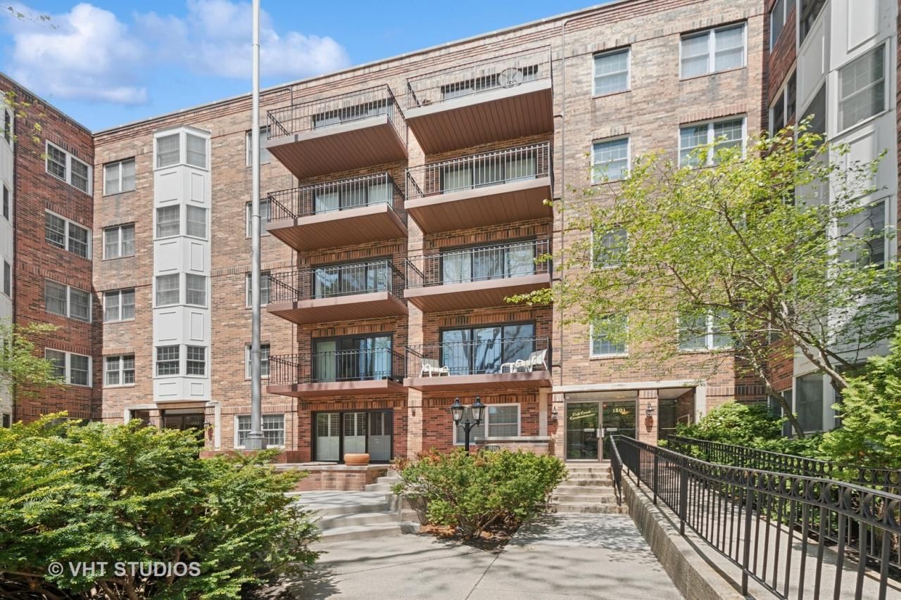 Fantastic location in downtown Evanston! Oak Court is convenient to shops, dining, lakefront, trains and University. This darling sunny one bedroom is set back within the courtyard and is very quiet! The bright open living and dining rooms feature a gas fireplace, neutral berber carpet and wide balcony facing south. Lovely views! Great closet space throughout plus a full-sized washer and dryer in the unit. The galley-style kitchen has good cabinet space, pantry and utility closet with room for table dining with a view south. Spacious primary bedroom provides a dressing area with counter space and walk-in closet plus linen storage closet. The hall bathroom has light colored original ceramic tile and laundry closet with shelving. This desirable elevator building is across from the Merrick Rose Garden and close to the YMCA with a pool. The unit also features a large storage locker on the same floor. Update with your own flair as needed.